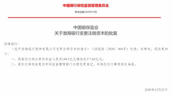 12月25日,银保监会发布了关于渤海银行变更注册资本的批复。批复显示,银保监会同意渤海银行将注册资本由人民币144.5亿元增加至177.62亿元。 以下为批复原文: