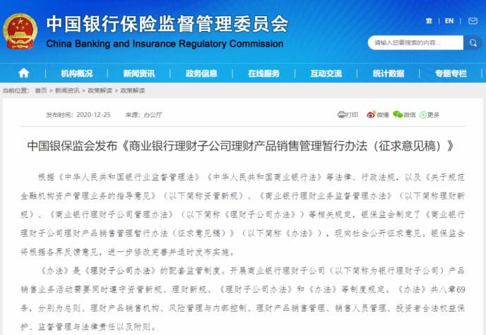 银行理财子公司产品销售新规出炉! 为规范商业银行理财子公司理财产品销售业务活动,保护投资者合法权益,促进理财业务健康发展,中国银保监会12月25日发布《商业银行理财子公司理财产品销售管理暂行办法(征求意见稿)》(下称:《办法》),现向社会公开征求意见。 银保监会明确,《办法》是《理财子公司办法》的配套监管制度。开展银行理财子公司产品销售业务活动需要同时遵守资管新规、理财新规、《理财子公司办法》和《办法》等制度规定。 《办法》提出,银行理财子公司从事理财产品销售业务活动,应向投资者充分披露信息和揭示风险,打破刚性兑付,不得直接或变相宣传、承诺保本保收益。下一步,银保监会将根据银行理财产品的转型发展情况,适时将理财产品销售机构范围扩展至其他金融机构和专业机构。 支付宝、理财通等第三方互联网平台不得代销产品 《办法》将理财产品销售机构分为两类:一类是销售本公司发行理财产品的银行理财子公司;一类是接受银行理财子公司委托销售其发行理财产品的代理销售机构。 银保监会有关部门负责人表示,《办法》现阶段允许银行理财子公司和吸收公众存款的银行业金融机构作为代理销售机构。银行理财子公司属于新型非银行金融机构,机构类型、产品属性、品牌声誉等处于起步培育阶段,区分辨识度需要逐步提升。现有销售机构范围总体延续了银行理财产品销售的成熟渠道模式,便于投资者识别。此外,《办法》与资管新规统一要求紧密衔接,明确规定未经金融监督管理部门许可,任何非金融机构和个人不得直接或变相代理销售理财产品。 《办法》对销售机构的这一划定,意味着明确了支付宝、理财通、京东金融等第三方互联网平台公司现阶段不能代销商业银行理财子公司的理财产品。 下一步,银保监会将根据银行理财产品的转型发展情况,适时将理财产品销售机构范围扩展至其他金融机构和专业机构。 打破刚性兑付,强调产品发行方和销售方“共同担责” 《办法》提出,银行理财子公司从事理财产品销售业务活动,应向投资者充分披露信息和揭示风险,打破刚性兑付,不得直接或变相宣传、承诺保本保收益。 《办法》坚持银行理财子公司和代理销售机构共同承担销售责任。银行理财子公司设计发行理财产品,代理销售机构面向投资者实施销售行为,共同承担理财产品的合规销售和投资者合法权益保护义务。 银保监会有关部门负责人表示,银行理财子公司是理财产品的设计发行方,主要责任是确定如实反映产品属性的统一信息内容和披露标准(即“是什么产品”),筛选合格的代理销售机构并实施持续有效管理(即“由谁来卖”),明确规范销售的执行标准和约束机制(即“如何管理卖方”)。代理销售机构面向投资者实施销售行为,主要责任是选择适宜本机构特点和目标客群的理财产品(即“卖什么产品”),履行投资者适当性义务评估筛选合适的投资者(即“卖给谁”),以及依法依规和按协议约定确保本机构及人员持续履行合规销售的管控义务(即“该怎么卖”)。 此外,《办法》还对银行理财子公司和代理销售机构分别提出机构和产品尽职调查要求: 针对银行理财子公司一方,要求其对代理销售机构的条件要求、专业服务能力和风险管理水平等开展尽职调查,明确规定准入标准和程序、责任与义务、存续期管理、利益冲突防范机制、信息披露义务及退出机制。 针对代理销售机构一方,要求对拟销售的理财产品开展尽职调查,承担集中审批职责,并纳入本机构统一专门名单管理,不得仅以银行理财子公司相关产品资料或其出具意见作为审批依据。 从事销售业务活动有18项不准 《办法》提到,理财产品销售机构及其销售人员从事理财产品销售业务活动,不得有下列18项情形: (一)误导投资者购买与其风险承受能力不相符合的理财产品; (二)虚假宣传、片面或者不当宣传,夸大过往业绩,预测理财产品的投资业绩,或者出具、宣传理财产品预期收益率; (三)使用未说明选择原因、测算依据和计算方法的业绩比较基准进行理财产品宣传推介; (四)将销售的理财产品与存款或其他产品进行混同; (五)在理财产品销售过程中强制捆绑、搭售其他服务或产品; (六)提供抽奖、回扣、馈赠实物、代金权益及金融产品等销售理财产品; (七)违背投资者利益优先原则,为谋取机构或人员的利益,诱导投资者进行短期、频繁购买和赎回操作; (八)由销售人员违规代替投资者签署销售业务相关文件,或者代替投资者进行风险承受能力评估、理财产品购买等操作,代替投资者持有或安排他人代替投资者持有本机构销售的理财产品; (九)为理财产品提供直接或间接、显性或隐性担保,包括部分或全部承诺本金或收益保障; (十)利用或者承诺利用理财产品和理财产品销售业务进行利益输送或利益交换; (十一)给予、收取或索要理财产品销售合作协议约定以外的利益; (十二)恶意诋毁、贬低其他理财产品销售机构或者其他理财产品; (十三)截留、挪用理财产品销售结算资金; (十四)违法违规提供理财产品投资者相关信息; (十五)未经授权或超越授权范围开展销售业务,私自推介、销售未经本机构审批的理财产品,在营业网点内存放未经本机构审批的理财产品销售相关文件和资料; (十六)未按规定或者协议约定的时间发行理财产品,或者