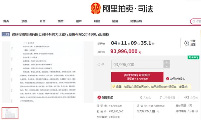 京东及阿里司法拍卖平台显示,本月末,两笔涉及辽宁省内两家城商行的股权将被挂网进行司法拍卖。 其中,锦州银行股份有限公司(以下简称“锦州银行”)6350.7万股内资股将以1.85亿元的底价进行第一次拍卖;大连银行股份有限公司(以下简称“大连银行”)4500万股股权则将以9399.6万元的底价进行第二次拍卖。两笔拍卖评估价合计约4.25亿元。 《每日经济新闻》记者注意到,这两笔股权挂网开拍的时间一样,同为2020年12月28日10时开始,至12月29日10时结束。而从持股方来看,这两笔股权皆是昔日中国民营企业500强锦联控股集团有限公司(以下简称“锦联集团”)旗下资产。两笔股权同日待拍 京东司法拍卖平台显示,12月28日上午,大连市中级人民法院将对锦程国际物流集团股份有限公司(以下简称“锦程物流”)持有的锦州银行股份有限公司(以下简称“锦州银行”)63507565股内资股股权进行第一次公开拍卖。 拍卖信息显示,这批锦州银行内资股将以1.85亿元的底价起拍,折合每股2.913元,与近2.57亿元的评估价相比,折价近30%。相关评估报告显示,上述锦州银行股权价值评估方法为市场法,评估基准日为2020年6月30日。 与此同时,锦程物流的控股股东锦联控股集团有限公司(以下简称“锦联集团”)也有一笔银行股权资产现身公开拍卖市场。 阿里司法拍卖平台显示,同样是在12月28日上午,北京市第三中级人民法院将对锦联控股集团持有的大连银行股份有限公司(以下简称“大连银行”)4500万股股权进行第二次司法拍卖。 记者注意到,上述大连银行4500万股股权的评估价为16785万元,就在不久前的12月11日~12日,该股权曾在阿里司法拍卖平台进行过第一次拍卖,当时的起拍价为11749.5万元,最后却以流拍告终。 时隔不到20天,在即将进行的第二次拍卖中,上述股权起拍价被下调至9399.6万元,与评估价相比,减少了7385.4万元,相当是以评估价的5.6折起拍。 拍卖信息显示,上述两笔待拍股权尚无优先购买权人。截至12月23日下午,锦州银行的股权一拍已有近1200人围观,7人设置关注提醒。同时,大连银行股权的二拍也吸引了7人设置关注提醒。不过,尚无竞买人报名。 值得一提的是,上述两起司法拍卖均与案件执行有关。其中,锦州银行股权拍卖涉及民间借贷纠纷案,执行标的为3.8亿元,申请执行人是中国长城(行情000066,诊股)资产管理股份有限公司大连市分公司;大连银行股权拍卖申请执行人是厦门国际银行股份有限公司北京分公司。皆为锦联集团旗下金融资产 锦联集团官网显示,锦联集团是中国民营500强企业,是一家集国际物流服务、供应链服务园区经营、供应链资产管理于一体的跨国和跨地区经营的企业集团。 公开信息显示,锦联集团成立于1990年,曾连续7年位列中国民营企业500强。不过,在2019年及2020年的中国民营企业500强名单中,未见其身影。 锦联集团其官网中还特别提及,集团旗下的企业是锦州银行和大连银行最大及最重要的股东之一。 记者注意到,在锦州银行2020年中期业绩报告中,提到了其股东锦程物流。报告显示,截至2020年6月末,锦程物流持有锦州银行213507565股内资股,是锦州银行第五大内资股股东。进一步追溯看,锦程物流实则是锦联集团旗下的公司,锦联集团持有其99.82%股权。 除了锦程物流外,同样是锦联集团旗下企业的长兴岛绿城发展有限公司(以下简称“长兴岛绿城”)也持有锦州银行33,179,021股内资股。股权结构显示,长兴岛绿城由锦联资产管理有限公司(以下简称“锦联资产”)持有99.76%的股权,而锦联资产95%的股权则由锦联集团持有。 综合来看,锦联集团旗下的锦程物流和长兴岛绿城所持有的锦州银行内资股合计近2.47亿股,占该行总股本的3.17%、内资股的5.78%。 据锦州银行披露,作为自然人的李东军,拥有锦联集团90%股权。根据证券及期货条例,李东军被视为拥有由锦程物流和长兴岛绿城所持全部股份的权益。公开资料显示,李东军为锦联集团董事长,并曾担任锦州银行非执行董事。 除了锦州银行外,如锦联集团官网所介绍,该集团也是大连银行的重要股东之一。 据大连银行2020年二季度信息披露报告,截至今年6月末,大连银行总股本为68亿元,锦联集团持有该行1.8亿股股份,占比2.65%,为该行第8大股东。 评估报告显示,锦程物流持有的锦州银行123507565股内资股股权已于2019年6月18日冻结。另据大连银行2019年年报披露,截至2019年末,锦联集团所持大连银行股权已处于质押、冻结状态。 作为被执行人,无论是锦程物流,还是其控股股东锦联集团,均可能在公开拍卖中失去对这批金融资产的所有权。如若两笔股权皆在此次拍卖中成交,锦联集团及旗下企业对两家银行的持股数量将不可避免地下降。锦联集团董事长已退任锦州银行非执行董事 值得一提的是,此次司法拍卖标的所涉及的两家银行总部均位于辽宁省,是该省辖内两家较为知名的城商行。 公开资料显示,大连银行注册资本68亿元,中国东方资产管理股份有限公司持有其50.29%股权,系该行控股股东。 目前,大连银行在北京、上海、天津、重庆、成都、沈阳、丹东、营口设立8家分行,在大连地区设有总行营业部及10家管理型支行,全行共184个营业网点,员工近6000人,2020年6月末资产总额为4263亿元。今年前三季度,该行完成营业收入55.59亿元,实现净利润6.88亿元。 相较大连银行,已在港股上市的锦州银行资产规模更大。2015年12月7日,锦州