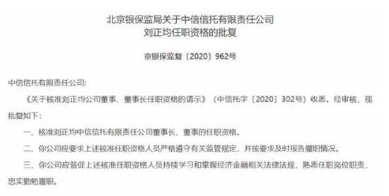 12月23日,北京银保监局发布批复,核准刘正均出任中信信托董事长、董事的任职资格。 刘正均是现任中国中信集团有限公司党委委员、副总经理,此次任职资格获批,他将兼任集团职务与中信信托董事长。 据介绍,刘正均此前长期在审计署工作,曾任审计署行政事业审计司司长、审计署法规司司长等职务。2018年下半年,刘正均调任中信集团副总经理。 中信信托目前注册资本112.76亿元,股东为中国中信有限公司和中信兴业投资集团有限公司,最终实际控制人为中国中信集团有限公司。该公司2019年年报显示,2019年,中信信托实现营业收入71.83亿元,手续费及佣金收入49.49亿元;净利润35.93亿元,同比增长7%,创公司历史新高;上缴国家税金43.89亿元,创公司历史新高。 截至2019年底,中信信托管理信托资产规模1.57万亿元,相比2019年期初的1.65万亿元有所下降。 16家子公司亏损 民生银行(行情600016,诊股)13位高管购入自家H股股票 12月23日晚间,民生银行发布公告称,该行高级管理人员于2020年12月23日以自有资金买入该行H股普通股股票,成交价格区间为每股4.18港元至4.30港元,并承诺将所购股票自买入之日起锁定两年。 具体来看,民生银行董事长高迎欣购入30万股民生银行H股,行长郑万春购入25万股,监事会主席张俊潼、5位副行长陈琼、石杰、李彬、林云山、胡庆华,以及财务总监兼董事会秘书白丹、工会主席万青元、监事会副主席郭栋、首席审计官张月波、行长助理欧阳勇合计11人,均分别购入20万股民生银行H股。