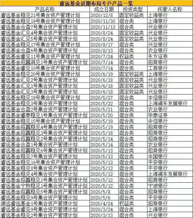 据此前渠道人士反馈,今年5月,睿远基金陆续在招商银行发行成立了名为睿远招赢稳见1号-6号的专户产品,其中,睿远招赢稳见1号自5月12日成立以来,截止12月11日,最新净值为1.2001元。