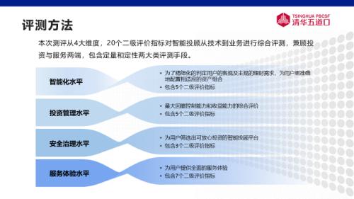 为此,清华大学金融科技研究院建立了四大维度的评测体系,分别是智能化水平、投资管理水平、安全治理水平、服务体验水平,每个维度下会设置不同的子项指标,更加全面的构建评测体系。