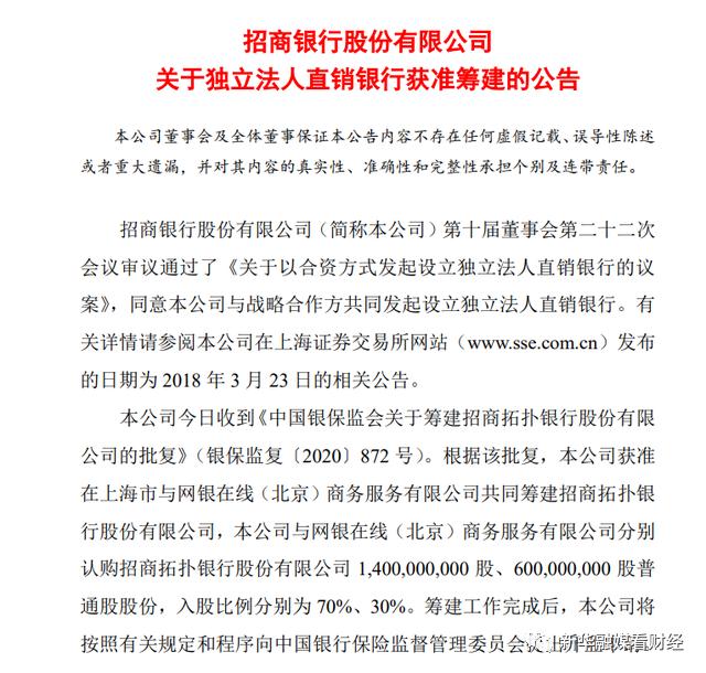 直至前不久的12月11日,招商银行公告称,收到中国银保监会的批复,旗下直销银行——招商拓扑银行股份有限公司(简称"招商拓扑银行")筹建已获准。