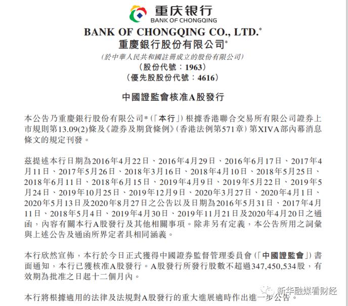 12月18日晚,证监会下发了重庆银行(行情601963,诊股)股份有限公司(重庆银行)A股IPO批文。随后重庆银行在港股发布补充公告表示,该行A股获批发行股数不超过约3.47亿股,批文有效期为12个月。这样,西部首家A+H股城市商业银行即将诞生,也将是全国第3家A+H上市的城商行。业内人士表示,预计重庆银行正式登陆上海证券交易所将在明年1月份左右。