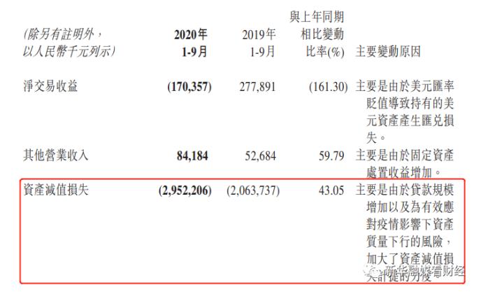 三季报称,由于贷款规模增加以及为有效应对疫情影响下资产质量下行的风险,重庆银行加大了资产减值损失计提的力度。2019年1月至9月,该行减值损失为29.52亿元,较去年同期的20.63亿元增长43.05%。资料显示,2019年重庆银行资产减值损失为36.14亿元,相比2018年的34.37亿元增长5.1%。今年重庆银行的资产减值损失攀升明显。