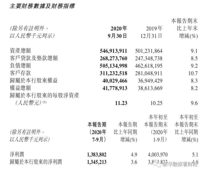 三季报显示,截至2020年三季度末,重庆银行的总资产为5469.14亿元,较上年末增加456.82亿元,增幅9.1%。客户存款为人民币3112.33亿元,较上年末增加301.84亿元,增幅10.7%。客户贷款及垫款总额为2682.74亿元,较上年末增长209.25 亿元,增幅8.5%。