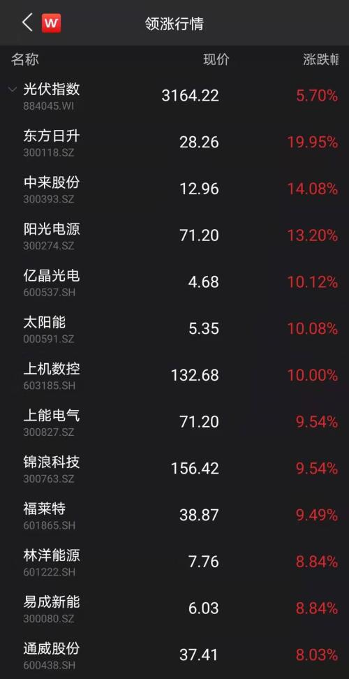 12月23日早盘,两市股指早盘震荡走升,新能源指数一马当先,暴涨6.77%;高瓴资本引领的光伏潮流继续闪耀全场,隆基股份再创新高。光伏屋顶指数上涨6.71%,光伏指数上涨5.7%。阳光电源(行情300274,诊股)涨超13%,市值破千亿大关。阳光电源、通威股份(行情600438,诊股)、隆基股份均再创新高。