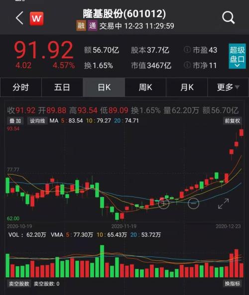 隆基股份大涨4.57%,高瓴资本入手价为70元每股,合计买入2.26亿股,两天半浮盈高达66亿元。