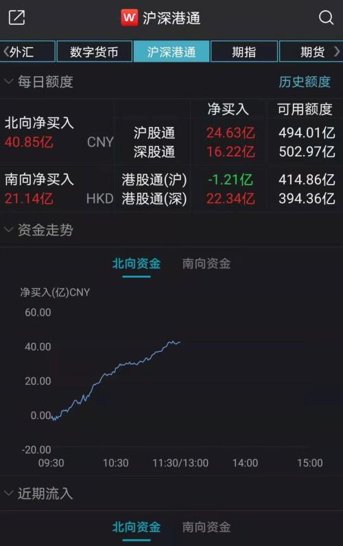 在昨天净卖出之后,今日早盘,北上资金再度加仓,半天净流入40亿元。