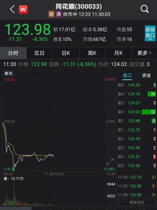 个股方面,同花顺早盘跳水,一度大跌12.78%至118元,股价创今年6月以来新低。