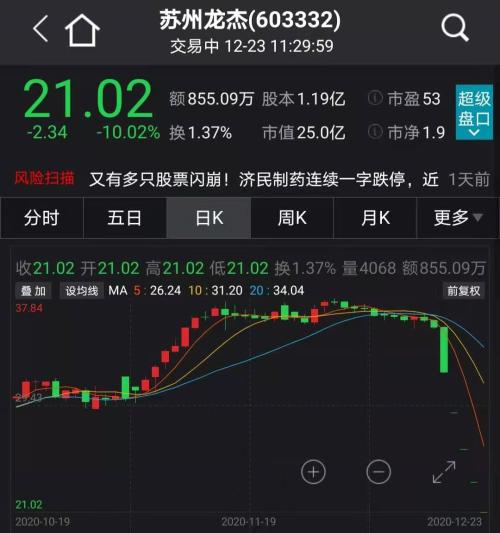 自12月16日突然跳水跌停起,济民制药便开启暴跌模式,在最近6个交易日内皆以跌停价收盘,股价腰斩。但是在这几个交易日里,仍有不少游资试图撬板,结果均已失败告终。