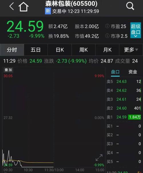 12月22日,新股N森林(森林包装(行情605500,诊股))上市交易,然而让投资者郁闷的是,第一天上市交易,44%的涨停,盘中反复被打开,直到尾盘,才再度拉升封涨停,最终收报27.32元。
