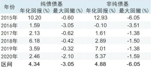 在债类基金中,纯债的年化回报和回撤(风险)均低于非纯债基。