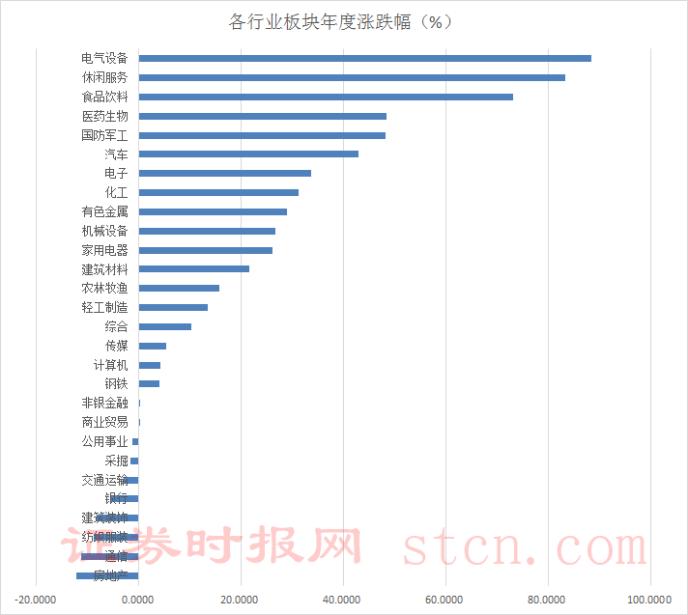 从今年行业板块涨跌幅来看,板块之前涨跌分化也十分明显。今年电气设备、休闲服务、食品饮料、医药生物、国防军工、汽车、电子、化工等多数板块均录得不错涨幅,但也有像房地产、通信、建筑装饰、银行等板块在大盘上涨的情况下,仍处于下跌状态。