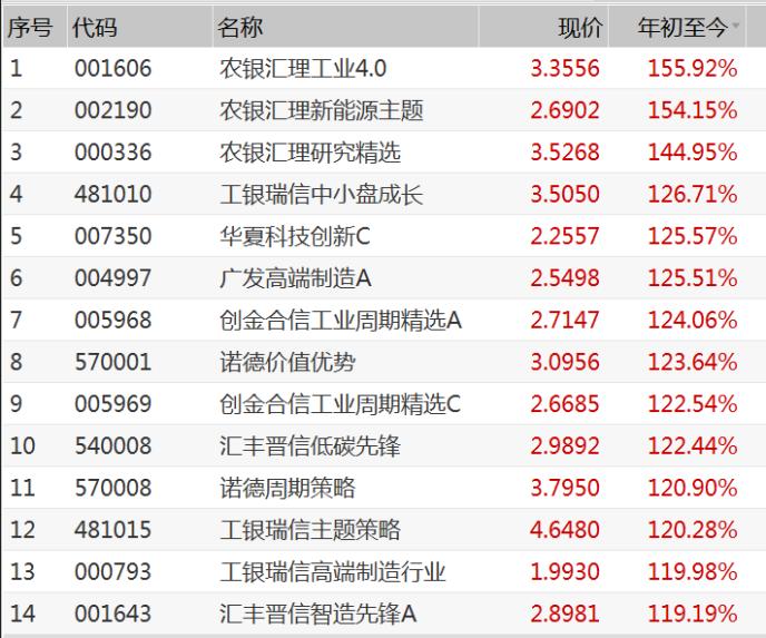 在今年少部分公司牛市的情形下,今年诞生了不少翻倍基金。据Wind数据显示,截至目前,有53只基金今年实现翻倍,其中年度收益率最高的基金为农银汇理工业4.0,达155.92%。而此前备受市场关注的广发高端制造A收益率排名下滑至第六。
